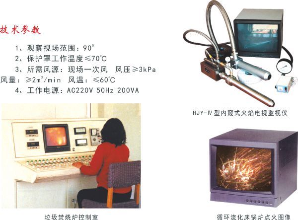 HJY-Ⅳ型內(nèi)窺式火焰電視監(jiān)視儀是用于監(jiān)測(cè)爐內(nèi)照度較低的循環(huán)流化床鍋爐及垃圾焚燒爐爐內(nèi)物料狀態(tài)的彩色工業(yè)電視系統(tǒng),該產(chǎn)品是我公司技術(shù)人員與光學(xué)研究所部分科技人員專門針對(duì)循環(huán)流化床鍋爐和垃圾焚燒爐而共同開發(fā)研制的,只要光照度大于10LUX的環(huán)境條件即能清晰成像,在國(guó)內(nèi)處于領(lǐng)先地位。對(duì)于循環(huán)流化床鍋爐,因?yàn)闋t內(nèi)為密封狀態(tài),在點(diǎn)火及投料過程中極易造成高溫或低溫結(jié)焦,而爐內(nèi)照度又很低,用國(guó)內(nèi)現(xiàn)有的爐膛火焰監(jiān)視裝置看不到爐內(nèi)物料狀態(tài)。如采用HJY-Ⅳ型產(chǎn)品可看到爐內(nèi)物料狀態(tài)并指導(dǎo)投料并及時(shí)發(fā)現(xiàn)結(jié)焦趨勢(shì),從而避免結(jié)焦或投料過多造成點(diǎn)火過程中滅火。而垃圾焚燒爐,由于污染問題,爐體為密封式,投料后極易將火壓滅,即使在燃燒時(shí),爐內(nèi)照度也非常低,通常在300LUX以下,而國(guó)內(nèi)常規(guī)產(chǎn)品需在500LUX照度下才能工作。所以只有采用HJY-Ⅳ型產(chǎn)品,才能指導(dǎo)投料及探針插孔并在遠(yuǎn)離現(xiàn)場(chǎng)的操作室內(nèi)清晰看到爐內(nèi)的垃圾焚燒狀態(tài),從而實(shí)現(xiàn)安全經(jīng)濟(jì)運(yùn)行。
